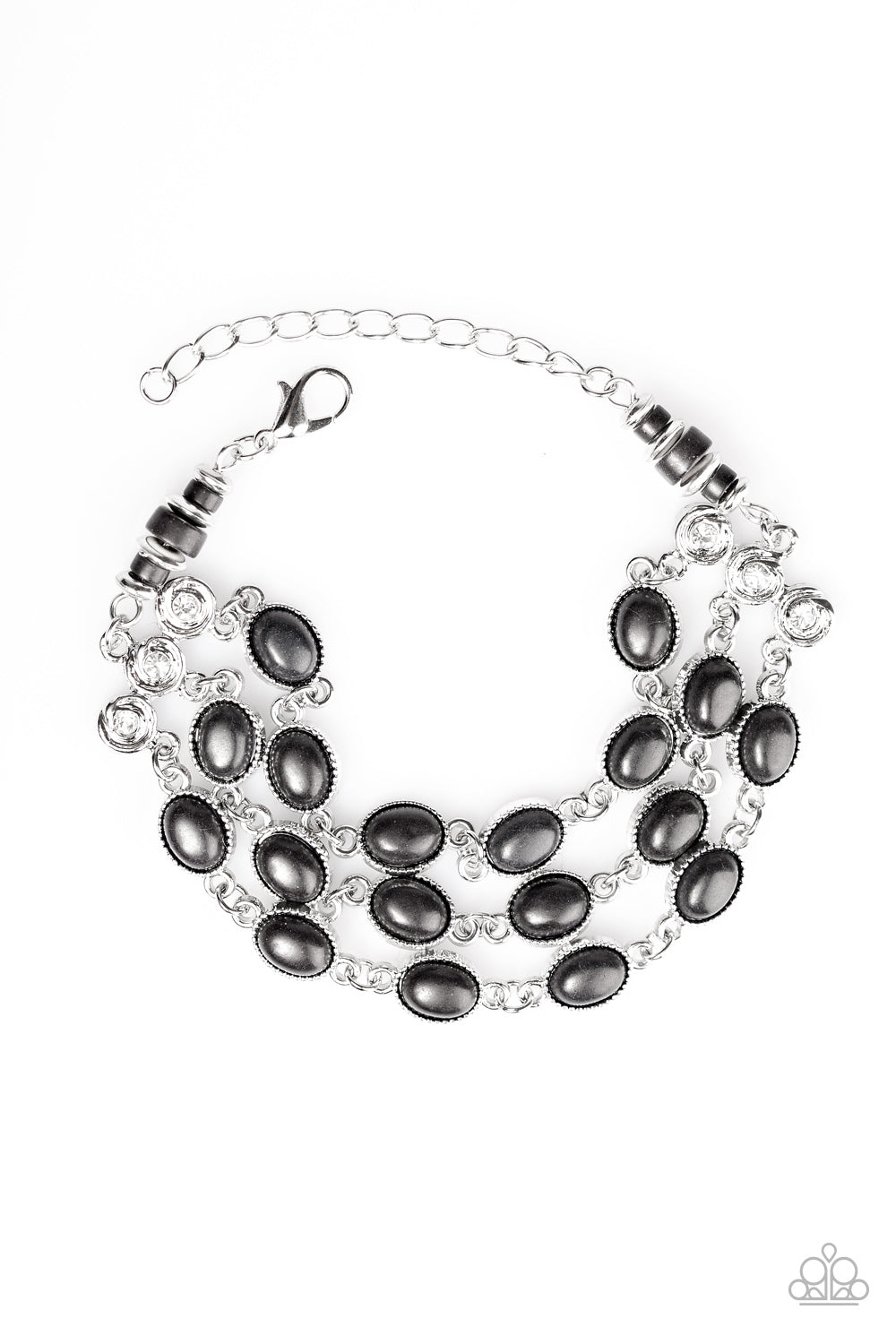 Attached to two rhinestone encrusted fittings, three strands of black stone beading wrap around the wrist for a seasonal look. Features an adjustable clasp closure.