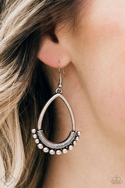 The bottom of an airy teardrop frame is studded with shiny silver beads, creating a tribal inspired lure. Earring attaches to a standard fishhook fitting.