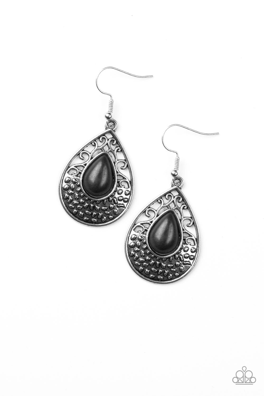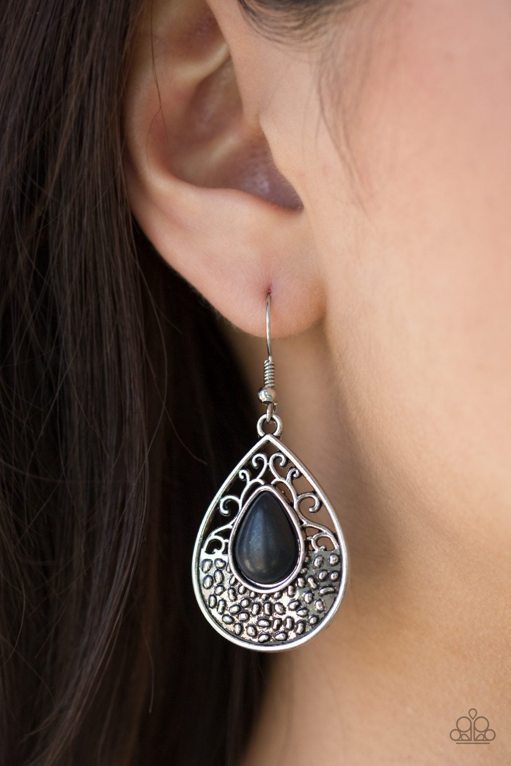 An earthy black stone is pressed into the center of a shimmery silver teardrop radiating with dotted and frilly filigree textures for a seasonal look. Earring attaches to a standard fishhook fitting.