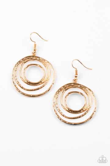 Delicately hammered in glistening shimmer, a gold wire coils into a dizzying lure. Earring attaches to a standard fishhook fitting.