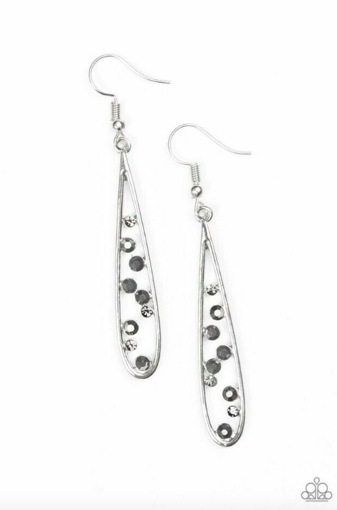 Dainty smoky and hematite rhinestones tumble down the center of a shimmery silver teardrop, creating an elegant lure. Earring attaches to a standard fishhook fitting.